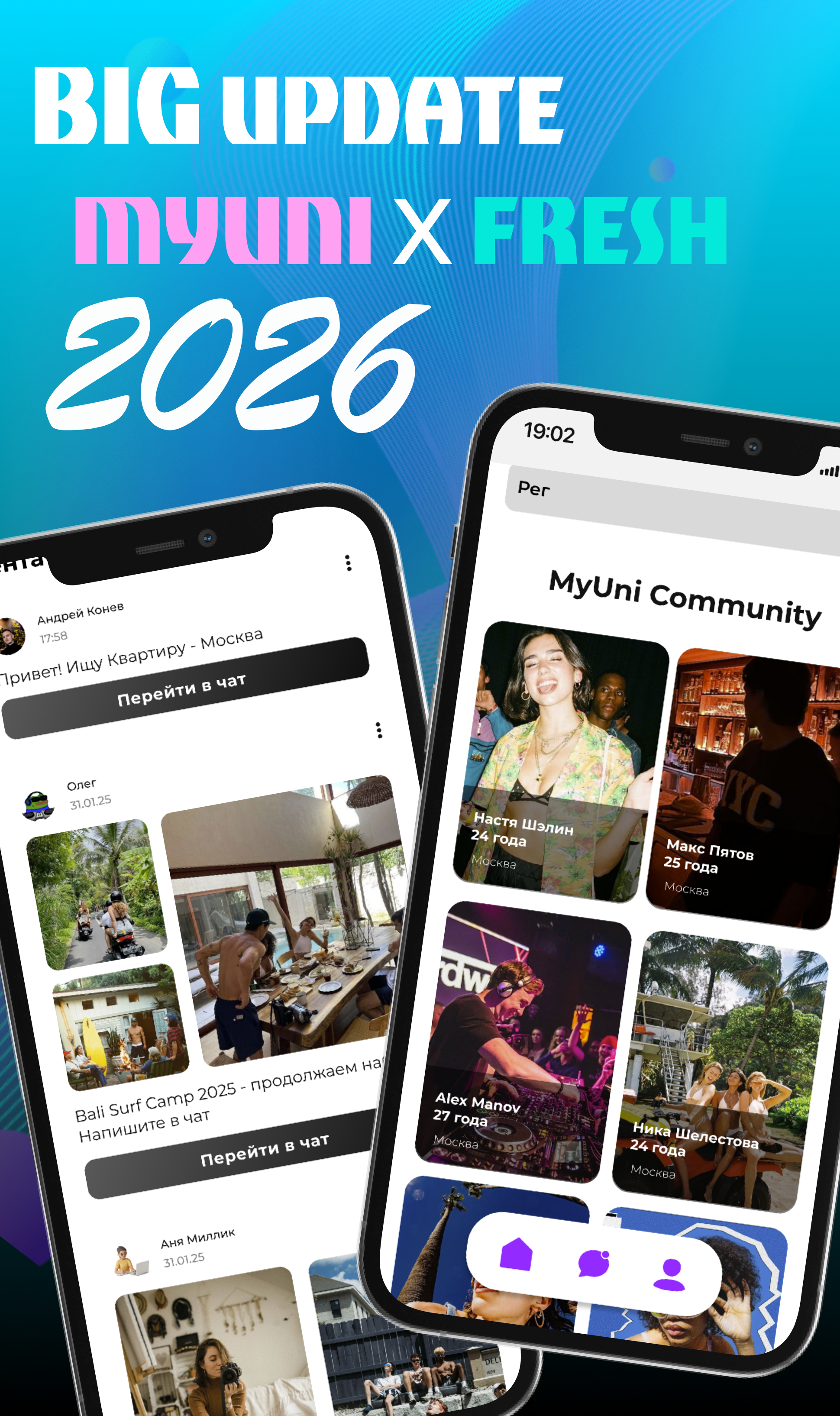 Fresh - проект от создателей MyUni, теперь охватывающий больший масштаб молодежных мероприятий за пределами университетов, объединяющий десятки сформированных крупных коммьюнити, фестов и тусовок. Проект позволит получить доступ к большему калейдоскопу мероприятий и ивентов партнеров