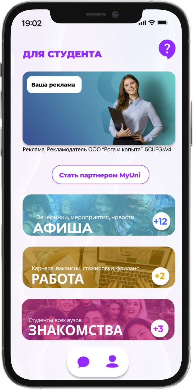 В приложении MyUni наша команда может отдельно интегрировать и реализовать ваш проект, нацеленный на молодежь и студентов в частности. Каждый партнер - это эксклюзивные условия и персональный подход реализации